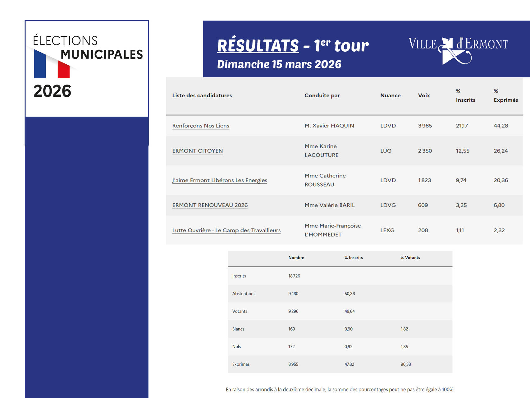- “Ermont Citoyen” (liste conduite par Karine LACOUTURE - Liste de l'Union de la Gauche)