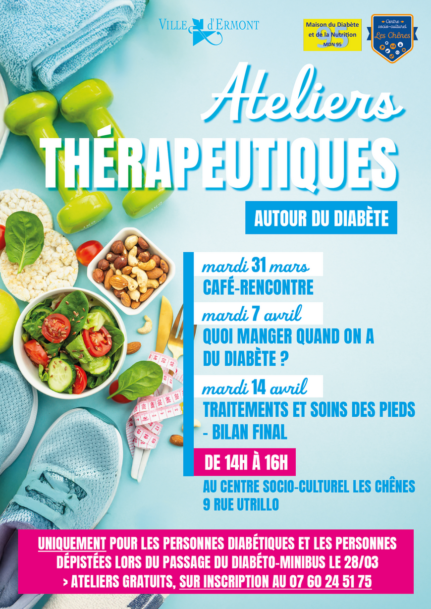 Dans le cadre de ses actions de prévention santé, le Centre communale d'action sociale (CCAS) en partenariat avec la Maison du diabète et de la nutrition 95, vous propose de participer à des ateliers thérapeutiques autour du diabète.